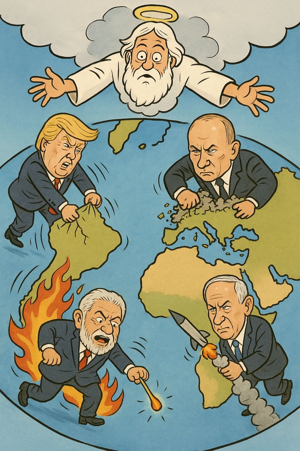 Trump tentando destruir o mundo. Putin destruindo a Ucrânia. Netanyahu destruindo o Irã. Aiatolá de Garanhuns destruindo o Brasil. Será que só Deus pode nos ajudar? Nas minhas mais de